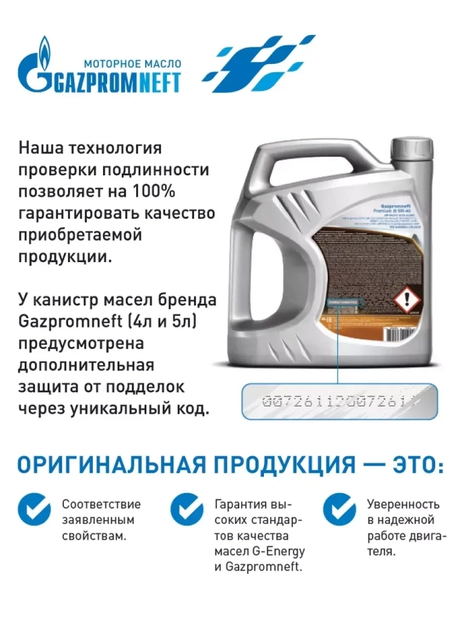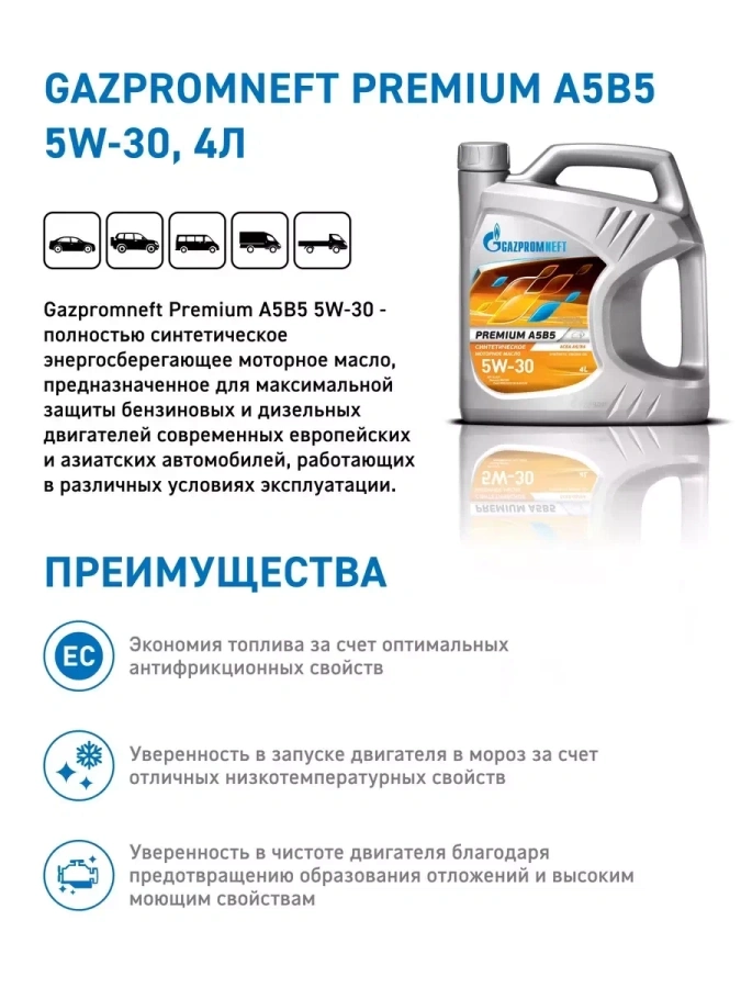 Gazpromneft Premium A5/B5 5W-30 — современное синтетическое моторное масло для бензиновых и дизельных двигателей в фасовке 1 литр (вес 0,85 кг).