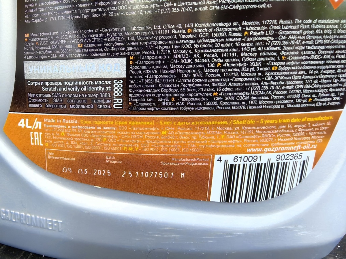 Gazpromnift Premium A5/B5 5W-30 — современное синтетическое моторное масло для бензиновых и дизельных двигателей в фасовке 4 литра (вес 3,41 кг).