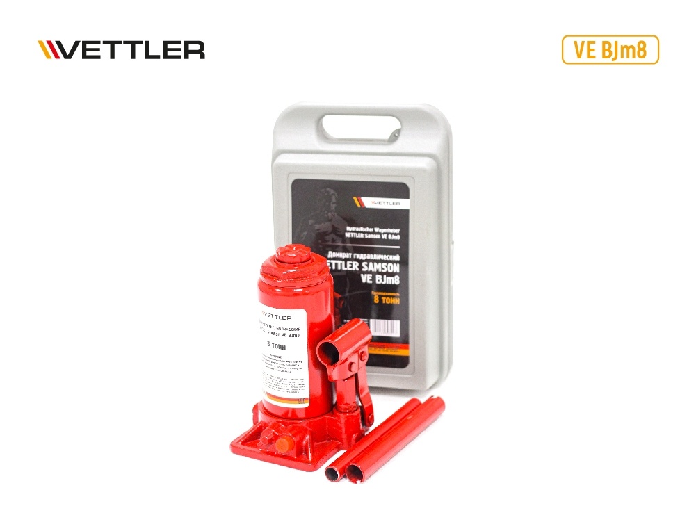 Производитель: VETTLER Артикул: VE BJm8. Конструкция домкрата: Бутылочный. Тип механизма: Гидравлический. Высота подъема, мм: 385. Грузоподъемность, т: 8. Высота подхвата, мм: 200. Вес, кг: 5.5. Кейс в комплекте: Да