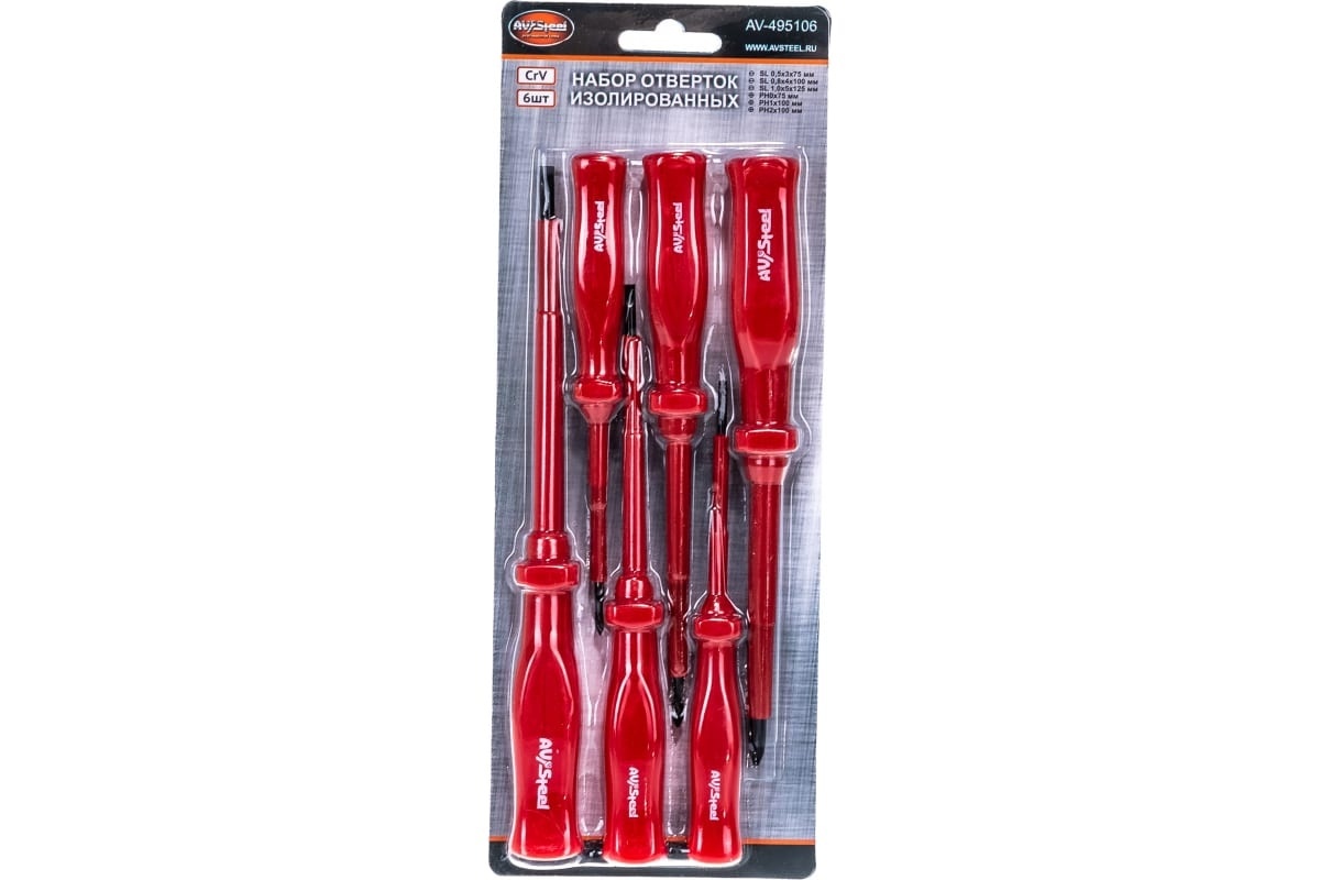Набор отверток AV Steel AV-495106 благодаря диэлектрическим свойствам позволяет эффективно и безопасно выполнять работу с крепежными элементами под напряжением. В данный набор входят 6 отверток с крестообразным и прямым наконечниками, а также тестер проверки напряжения. Жало отверток изготовлено из долговечной хромованадиевой стали, которая отличается стойкостью к повреждениям и износу. В отвертках AV Steel AV-495106 установлены эргономичные пластиковые рукоятки, которые гарантируют комфортное удержание.