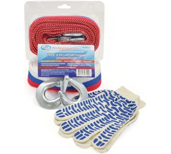 Трос буксировочный 5 т*5 м - лента 2 крюка +перчатки (блистер) AUTOVIRAZH AV-600050
