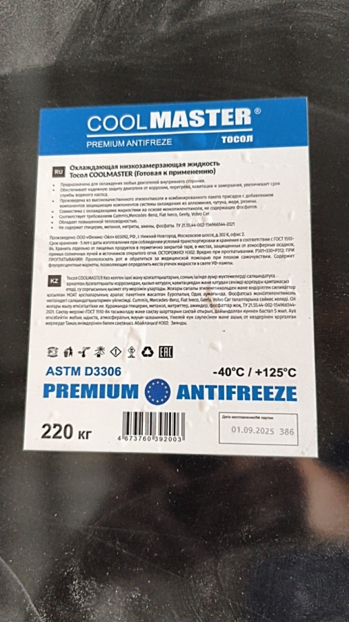- тосол готовый к применению — 220 кг (≈205 л);